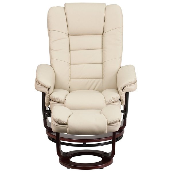 - Recliner and Ottoman Set - Integrated Headrest - Plush Upholstered Arms - Lever Adjusting Recliner - Swivel Seat Ball-Bearing Swiveling Base on Recliner - Mahogany Wood Base with Floor Glides